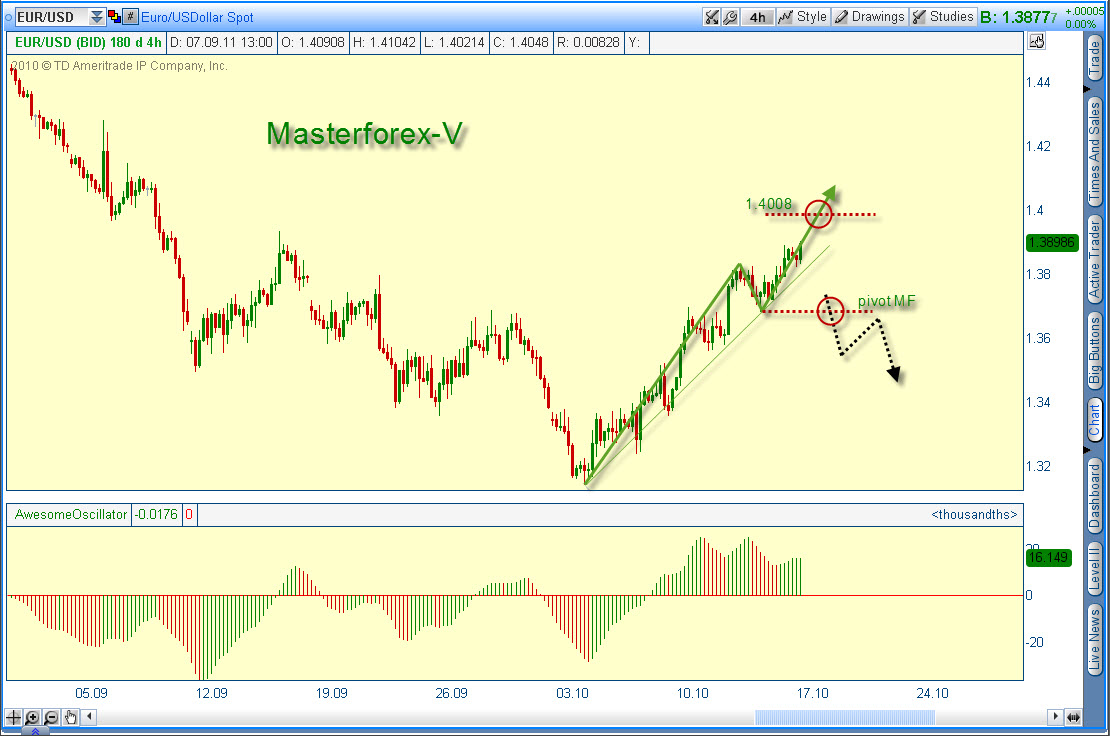 Как отмечают профессиональные трейдеры факультета детального изучения торговой системы Masterforex-V, курс европродолжает бычье среднесрочное движение. Ближайшим уровнем сопротивления выступит уровень 50% в области 1,4008. Говорить о развороте среднесрочного тренда можно будет только лишь после пробития пивота МФ в области 1,3686 с последующим медвежьим ФЗР.