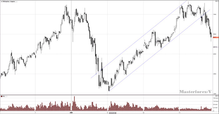 • "Норникель": в районе 8000-7000 произошла фиксация прибыли после чего был пробит восходящий канал и цена показала стремительное снижение. На данный момент в районе 5000(бывшая зона консолидации крупных игроков) начали появляться повышенные объемы после которых возможна остановка и откок цены от данного уровня.
