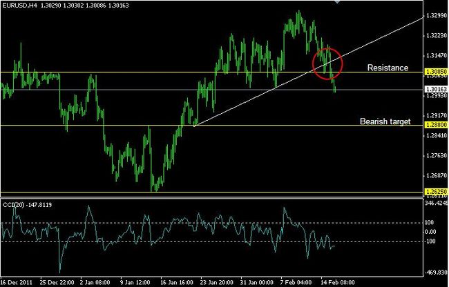 Пара EURUSD вчера осуществила значительны медвежий импульс, закрылась ниже 1.3085 и пробила ниже трендовой линии поддержки, как вы можете видеть на графике, и достигла 1.3006 сегодня. Этот факт завершает бычий прогноз и изменяет внутридневное смещение в медвежью сторону, нацеливаясь на 1.2880. Сопротивление находится возле 1.3085 – 1.3100. Четкий пробой выше этой области может привести цену в нейтральную зону в ближайшее время, так как направление останется неясным.