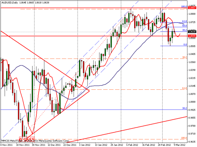Напомним, до настоящего момента аусси в течение нескольких последних дней испытывал давление на фоне сопроводительных комментариев Резервного Банка Австралии относительно дальнейшей денежно-кредитной политики. Появились намеки на то, что Банк будет соответствующим образом реагировать на показатели инфляции и экономический рост в стране. На следующий день были опубликованы достаточно скромные данные по ВВП за 4 квартал, характеризующие некоторое замедление темпов роста в стране. В связи с этим продажи возобновились, и пара преодолела важный уровень поддержки 1.0599, снижаясь в моменте до 1.0511.