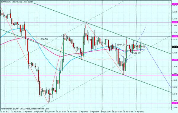 Новости Форекс, курс евро. Вчера курс евро оставался в пределах диапазона предыдущих дней. Минимум дня был отмечен на уровне 1.3057, затем курс вырос до 1.3135. Сегодня на азиатской сессии евро остается в коридоре около 20 пунктов. Сформировался новый нисходящий канал по минимумам дней. Скользящие средние на часовом графике находятся в нейтральном положении. Сейчас цена находится около средних линий у верхней границы канала. Отсюда может продолжиться снижение к нижней границе канала. Вчерашнее предположение о снижении подтвердилось. Из-за отсутствия других экономических показателей влияние могут оказать аукционы испанских ценных бумаг, считают аналитики компании Forex Broker.