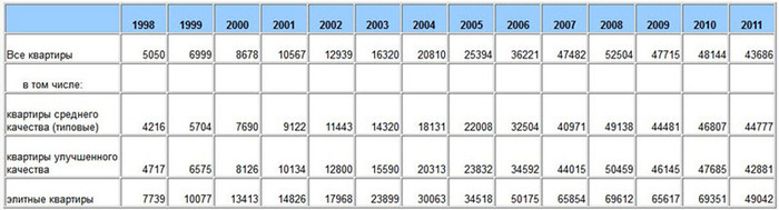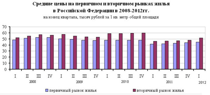 Так, в августе 2008 г. стоимость кв. м на первичном рынке Столицы Российской Федерации была 6009 $, на рынке вторичного жилья – 7 364 $. В апреле 2012 года кв. м на рынке новостроек достиг 12 618 $, или 378 549 руб. (с учетом элитных предложений ЦАО). Усредненная цена кв.м. на рынке вторичного жилья в апреле составила 7 514$ либо 225 416р.