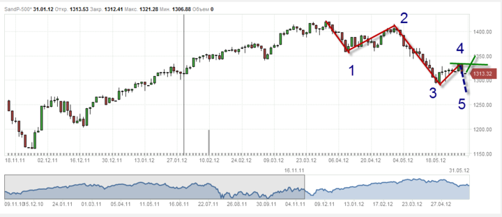Техно картина. Волновая структура вниз S&P 500 отрабатывается успешно. Коррекционное движение, которое можно рассматривать, как волна 4, после которой можно ожидать тестирования минимумов ниже 1,300 и создания фигуры разворота с подтверждающими дивергенциями индикаторов. Это будет волна 5.