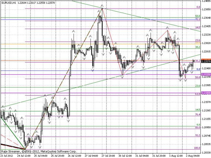 В среду стало известно, что Федрезерв на протяжении двухдневного заседания не принял никаких решительных действий. Вечером во время своего выступления руководитель ФРС Бен Бернанке озвучил, что в ближайшее время количественное смягчение проводиться не будет, а операция Твист продлится до конца текущего года. Текст протокола заседания FOMC показал, что риторика управления ФРС в общем не претерпела значительных изменений, что отдало повод для брутальных покупок USD, в результате чего же курсу EUR не получилось окопаться выше значения 1,2300. В результате чего пара достигла поддержки 1,2220.