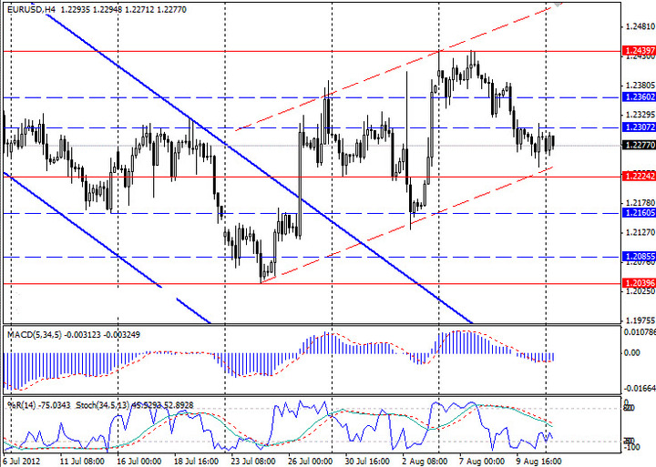 Курс EUR практически достиг цели на уровне 1.2220. Сильная поддержка вблизи этого уровня не дозволила торгам опуститься ниже, и пара начала консолидацию, которая сейчас проходит в спектре 1.2290-1.2250/30. Показания индикаторов сохраняют «медвежий» настрой, но с некоторым ослаблением. Эта обстановка может свидетельствовать о некой неуверенности рынка. но все таки, предпочтения продолжают оставаться за продолжением краткосрочного понижательного тренда, но предстоящая реализация данного сценария может быть отложена на немного более позднее время, т.к. прочность тестируемой поддержки способна спровоцировать продолжение формирования бокового диапазона.