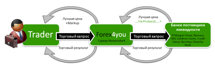 Собственно говоря, - рассказывает представитель Forex4you, - даже на реальных торгах на классических счетах нашей компании вы мало рискуете при разумном манименеджменте: наши технологии позволяют торговать конкретно с лучшими глобальными поставщиками ликвидности, посреди которых Deutsche Bank, Barclays, Goldman Sachs, JPMorgan UBS, Credit Suisse и др. При всем этом ордера исполняются во всех вариантах, по лучшей для вас стоимости, при сквозной обработке транзакций. Графически систему подобной, весьма удобной и выгодной, даже для неопытных трейдеров торговли, можно показать следующим образом: